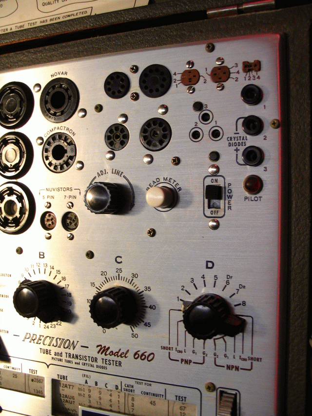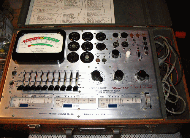Precision Tube TestersA web page devoted to the various models of Tube Testers made by the Precision Apparatus Corporation, who were eventually bought up by B&K Instruments Here's a picture of my Precision 660 ... this is different from all other 660s I've seen in that it has more transistor and tube sockets. I refurbished the case, since the original cloth-like covering was very tatty. To do this I removed all the material, sanded down the surfaces, and applied three coats of Danish Oil.