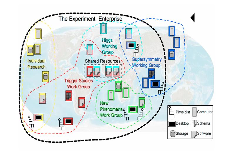 The diagram shows a "snapshot" in time of analysis activities in the experiment. Groups of individuals, separated by large geographic distances, are working on specific analysis topics, Supersymmetry, for example. Resources in the Grid system are being shared between the active groups. The dashed line boundaries enclosing each of groups, move and change shape and size as the composition or requirements of the groups changes.