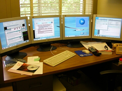 We have constructed a four-screen desktop analysis setup that operates from a single server, using a single graphics card. The 4-way graphics card used allows an affordable setup to be built that offers enough screen space and pixels for most or all of: