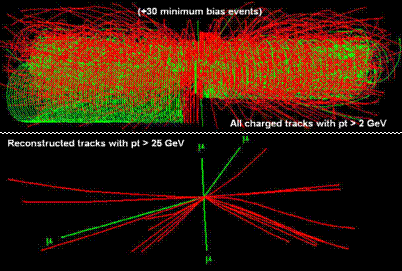 Higgs Boson into four Muons. The lower picture shows the high momentum charged