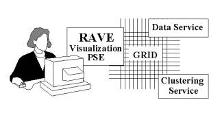 We envision a client investigator, at a machine that can do 3D graphics with a visualization and problem-solving environment (RAVE), that is built on software such as NAG’s Iris Explorer. The client can select from a variety of modules that get or process data locally, or modules that get or process data at a remote location. For example, a multidimensional point-cloud may be sent to a clustering service, and it returns with each point “colored” according to the cluster to which it belongs. Or the client may request a dataset from a remote astronomical catalog, receiving it transparently.