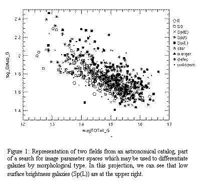 Figure 1 shows an example of a figure from another system [Skyv] [Odew] which motivated this proposal, and which has generated significant progress in statistical astronomy. As all-sky surveys such as 2MASS, DPOSS, and Sloan come online, there is an urgent need in the stronomical community for tools for visualization and data-mining.