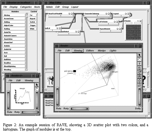 We propose to implement RAVE as a modular system which offers dynamic functionality to perform tasks in data clustering, data mining, and data visualization. Furthermore, we intend for such system to be capable of interfacing as a module itself with outside data sources, computational engines, and display systems.RAVE will be a Problem Solving Environment directed towards working scientists who wish to get insight quickly. RAVE will be constructed using the Iris Explorer visualization package by NAG, so that it can run on all popular workstations, including Windows, HP, Sun, and SGI. The user is intended to begin work at the desktop, generating the 3D graphics locally with OpenGL, or remotely, with transport through 3D X-windows. Iris Explorer can also run on very high-performance graphics systems such as the Immersadesk or Cave. Figure 2 shows an example RAVE session.