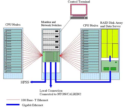 Each contains approximately 40 rack-mounted, dual CPU Pentium III Linux computational nodes, a multiple terabyte RAID disk array connected to one or two servers, a network switch, and connections to the existing high performance storage systems (HPSS) at CACR and SDSC. The computational nodes are networked using 100 base-T Ethernet connections. The servers are connected using Gbit Ethernet. Past experience indicated that a 100 base-T Ethernet connection would be sufficient for a dual CPU machine running CMS software performing reconstruction or simulation, when data have to be streamed across the network. An important aspect of the research agenda is to determine the optimal network configuration (in terms of topology and bandwidth) for each system: the initial configuration does not experience network bottlenecks when running the expected batch and interactive loads, but can become bandwidth limited when running certain specialized tasks.