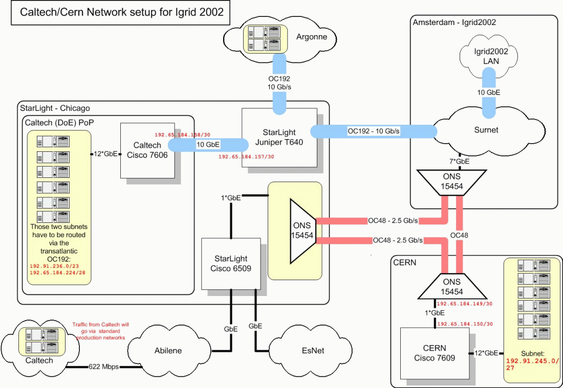 Six of the eight nodes in the cluster has a SysKonnect 9821 copper Gigabit NIC. The other two (one of which is the "mayor" or head node) have SysKonnect 9822 dual port copper Gigabit NIC's. These are connected to an Extreme 5i switch, which is a 16 port Layer 3 capable switch rated to be a non-blocking line speed switch. The switch has 12 copper ports, and 4 GBIC ports. During the show, each switch will be connected to our booth router, a Black Diamond on loan from Extreme via (2) Gigabit Fiber uplinks. Our booth router will be connected to the iGrid showfloor network via (4) 1 Gigabit fiber drops. We traveled multiple networks from there to the various sites, but most traffic came across Abilene, ESNet, and Startap. The client application running on the cluster will initiate GridFTP transfers of ROOT data files from servers at Argonne, Caltech, CERN and possibly UCLA and Rio de Janeiro. The client application is ROOT with Clarens modifications. The ROOT data files are simulated JETMET data from the CMS Experiment at CERN. The following diagram shows the international network setup currently envisaged:
