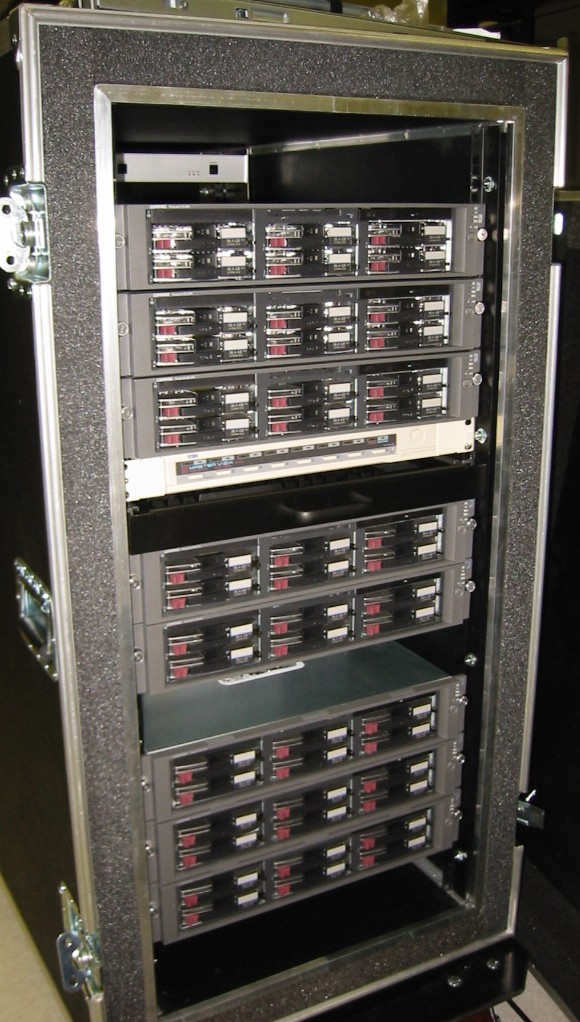 Hardware/Software/NetworkingThe client hardware on the show floor will consist of an 8 node portable cluster. Each node in the cluster is a 2U Compaq DL380G2 server with 1.13 GHz PIII, 512MB RAM, and 6x36GB SCSI hard drives with onboard HW RAID, using RAID 0, dual redundant power supplies, and redundant cooling fans. The node is mounted in a shock mounted case with casters, along with KVM, 1U LCD screen and keyboard for local maintenance, and BayTech network accessible power controllers for remote power cycling, should that be necessary.