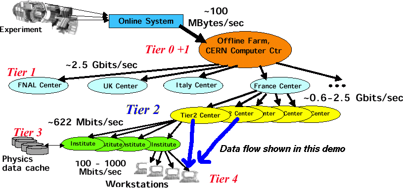 DescriptionUsing distributed databases at Argonne, Caltech, CERN, possibly UCSD and other HEP institutes, we will show a particle physics analysis application that issues requests for remote virtual data collections, causing these to be moved across the WAN using both striped and standard GridFTP servers. As the collections are instantiated on the client machine in Amsterdam, the analysis results are rendered in real time. This scheme is a preview of a general "Grid Enabled Analysis Environment" that is being developed for CERN's LHC experiments. BackgroundThe European Nuclear Research Center (CERN) will be bringing the Large Hadron Collider (LHC), the most powerful accelerator in the world, on line in 2006. This system is projected to produce 20 Petabytes of data per year. To handle such large volumes of data, the High Energy Physics (HEP) community is proposing a multi-level or tiered distributed computing system. Tier 0 is CERN and will ultimately hold all raw and reconstructed data for the project. Tier 1 sites are national level, Tier 2 are large universities, Tier 3 are smaller universities, and Tier 4 is the individual researchers. Any data produced at a lower tier, such as analysis results and Monte Carlo simulations, will frequently need to be pushed up to higher levels.