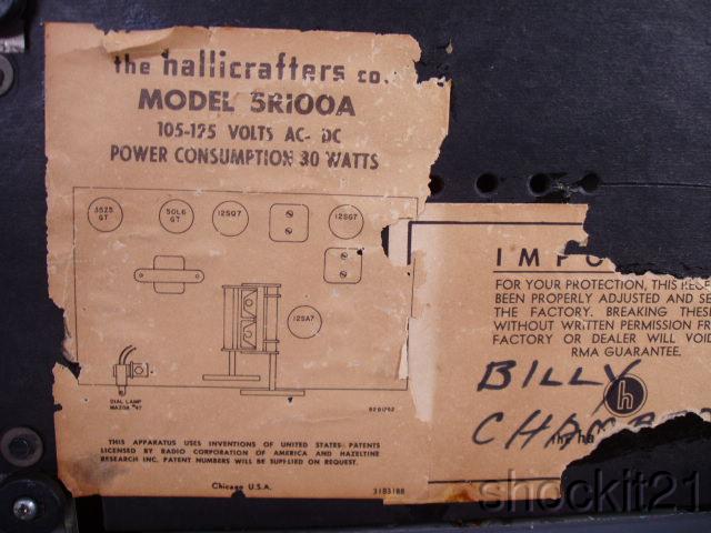 Hallicrafters 5R100A Communications Receiver (Run 4, S/N F153782)Another Ebay purchase. This 5R100 cost me $25. The dial string was broken, and the main electrolytic capacitor was leaking and clearly bad. Other than that, the radio was in good condition. Here's a photo from the seller: