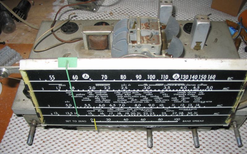 The dial glass after cleaning. I re-strung the tuning control using fishing line. At the time I didn't have a re-stringing diagram, so was working from first principles. Amazingly, it works.