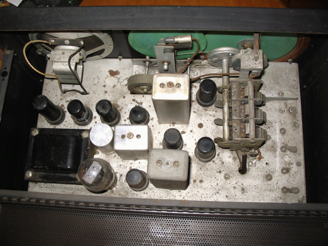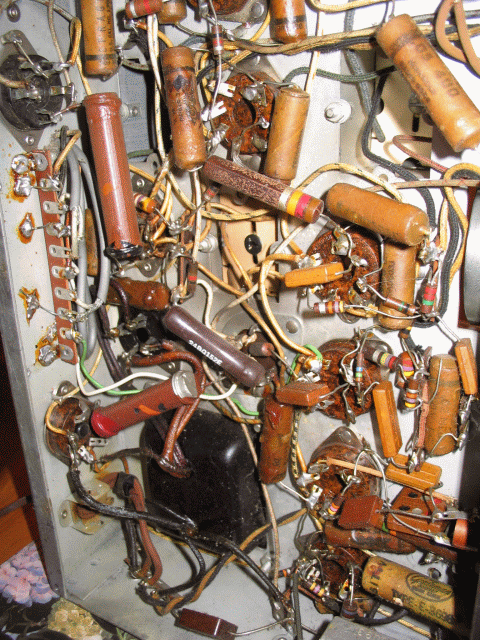 Purchased on Ebay for $36.00. Made a loud hum when powered up. Inspection under-chassis showed a lot of wax paper capacitors that looked like they were on their last legs, or dead. (Notice the tag strip soldered to the chassis, on the left hand side of the picture ... this is mentioned above.)