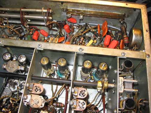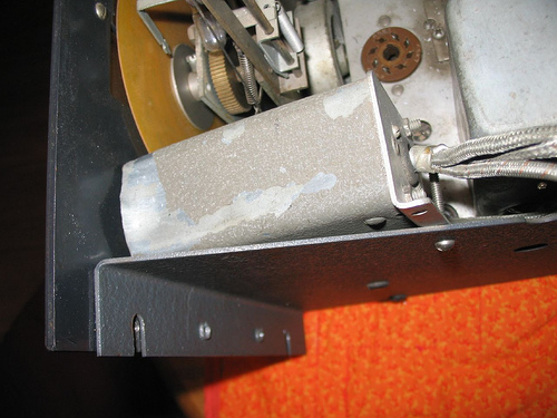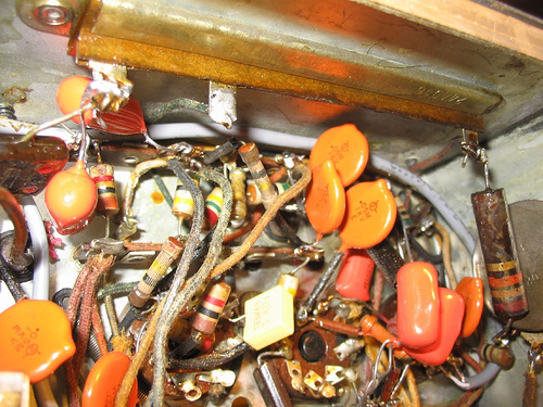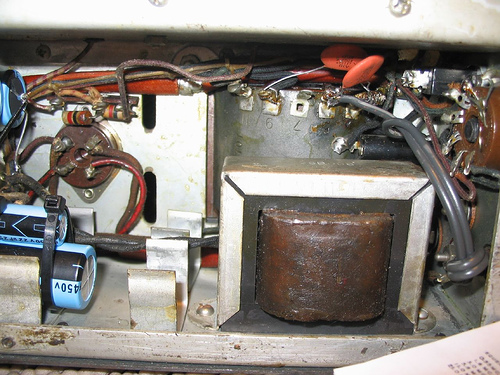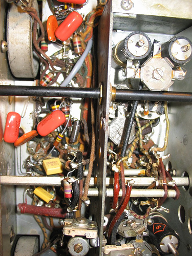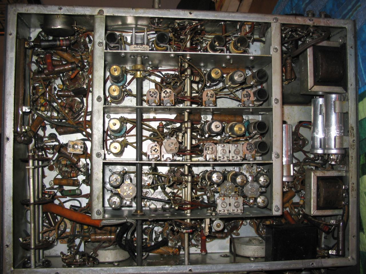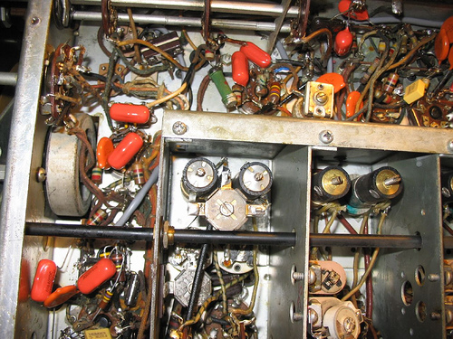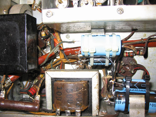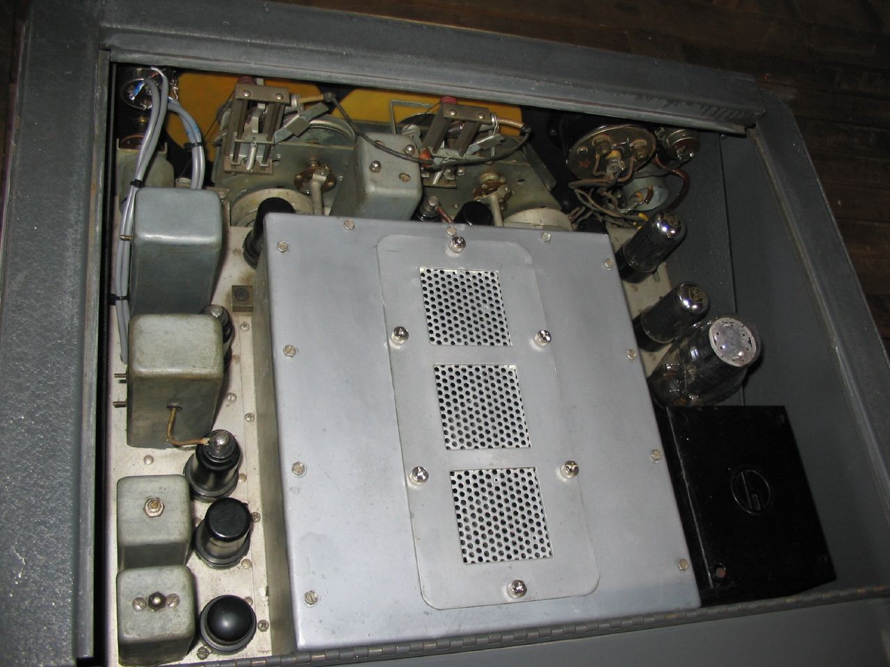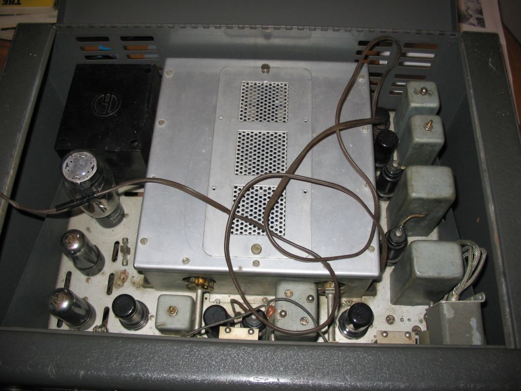 (Notice the screws for the RF box cover: these are modern PC parts) Under the chassis before component replacement began: