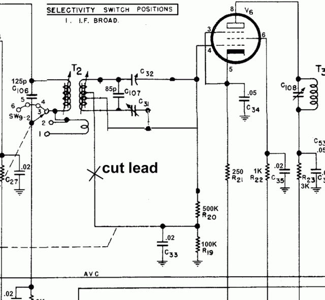 T2 IF TransformerWhile recapping the IF and Audio stages, I noticed that a wire to the T2 IF transformer had been snipped at some point in the past. Various people suggested thiswas an accident, rather than a deliberate modification. Chuck McGregor drew the following schematic, showing where the cut was, and pointing out: "In trying to figure out Hallicrafters poor schematics with their complicated multi-position switching, I have found it useful to redraw the circuit for each position of the rotary switch, leaving out any components that are open circuited in that position, and replacing shorted components with wire links. Example for switch position 1 is attached. When you do that, it's immediately obvious that C33 is the IF-frequency ground return for the secondary of T2...... and the V6 grid circuit, thru T2 secondary, is open circuited (for IF) with that link cut. So, any signal at all that makes it thru is due to stray capacitances, and the performance oughta be lousy."Here's the schematic section involved.