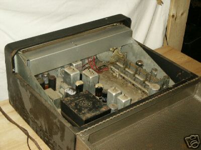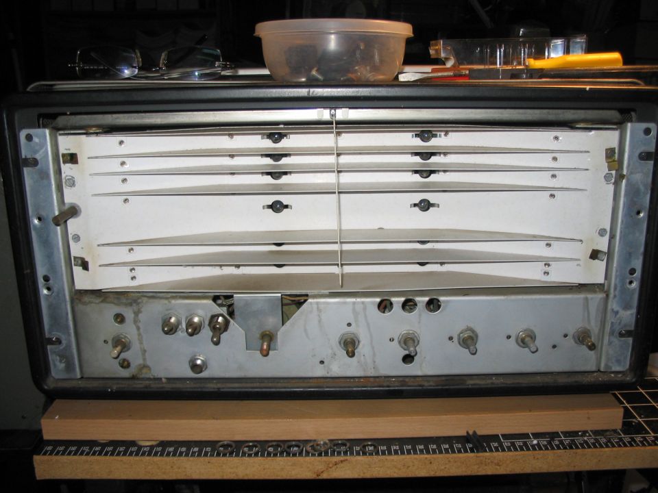 This is a picture of the chassis, after cleaning, some polishing, bulb replacement and dial restringing. There are some areas of surface rust on the chassis which were cleaned out. Then a thin layer of machine oil was rubbed in. The dial bulbs (#44) selected in pairs for similar brightness. I left alone the orange "RUN 2" mark.