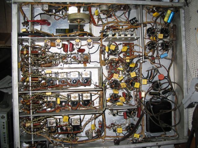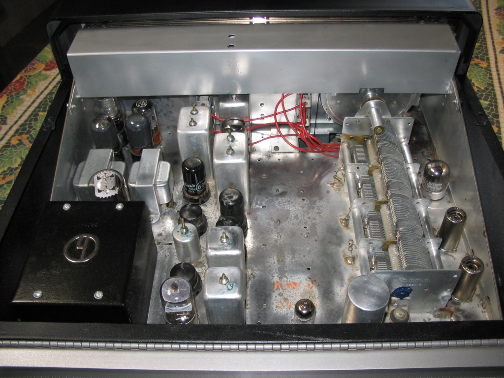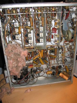 The audio transformer was burned out. I posted to the Hallicrafters list, and a member had a spare, which he sent me for $35. This receiver had hosted a family of mice at some point: here's what it looked like before cleaning and recapping.
