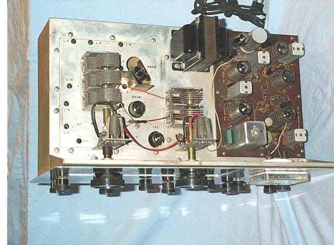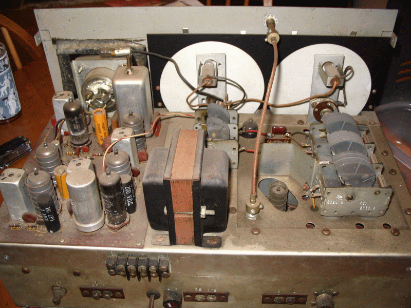 The crystal oscillator unit is the small rectangular box with one tube, a slide switch, and a 100kHz crystal, in the centre of the above photograph. Notice what appears to be charring and evidence of burning around the wiring entering the mains transformer, just to the left of the crystal oscillator. RestorationInitially I powered up the radio to see if it was working. I could pull in a couple of stations, but there was a lot of crackle and noise, and the volume control didn't seem to work. I completely dismantled the front panel, which was filthy with grime and nicotine deposits, rubbed it down to the bare metal, and repainted it in metallic grey car paint. I washed the dials and other plastic fittings from the front panel in a slightly soapy solution. The metal strips which attach to the front panel I rubbed carefully with steel wool, avoiding the lettering. After removing the bright metal trim, the case received a strong rub-down with emery paper, and then a repaint in burgundy red car spray. All the knobs were washed in soapy water with an old toothbrush, taking care not to rub too hard on the small white marker dots on each rim. Then I blew out the chassis with compressed air, and rubbed it clean with steel wool, trying to keep as much of the debris away from the PCBs. I then removed each tube in turn, and sprayed the pins and tube socket with a de-oxidising and silicone spray. I then lightly oiled all the bearings and moving parts on the tuning capacitors and other connections, using WD40. I removed a custom terminal block on the rear of the chassis, which a previous owner had installed to, apparently, have an easy way of monitoring B+ and other voltages on the chassis. I removed all the wires connecting the block. The front panel was re-assembled and attached to the chassis. The connection to the aerial trimmer was re-made. At this point, I turned the receiver back on, and noticed that R27 smoked, so I quickly turned it off again. Underneath the chassis, on inspection, it became apparent that the IF circuit board had a problem: it was slightly cracked around one of the 6AZ8 sockets. A previous owner had tried to re-make some of the copper tracks, which were almost invisibly cracked in places. This hadn't been entirely successful, because checking with multimeter revealed a short in that area. Thus began a series of strange repair-resistor smoking-repair cycles, which in the end turned out to be caused by a combination of the cracked PCB and a very small piece of steel wool that had somehow made its way (been blown, probably) into the inside of one of the IF cans. This can had to be physically removed from the PCB before the problem was discovered. Once this was fixed, and some more sturdy repairs to the copper tracks made (by running new copper wire along the length of each track, spot soldering) that part of the circuit worked fine - well, at least the voltages all measured correctly according to the manual. Next, the radio still wasn't working well. On the other hand, the Crystal Oscillator was: its output was an excellent modulated 100kHz sine wave on the 'scope. The radio seemed insensitive, and very crackly in regions of all bands. Some stations were heard on Band A, but almost nothing on the other bands. Trying out the Q Multiplier, the QX Tune variable capacitor produced some sparks between the plates as it was rotated! The cause of the poor performance was identified on the RF board. The voltages were too low, and a burned 2.2k resistor was found after unscrewing and removing the board. Once replaced, the receiver sprang to life, and an alignment could be attempted.
