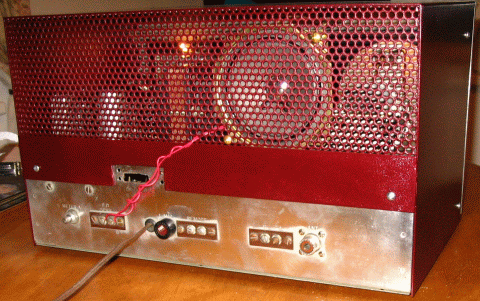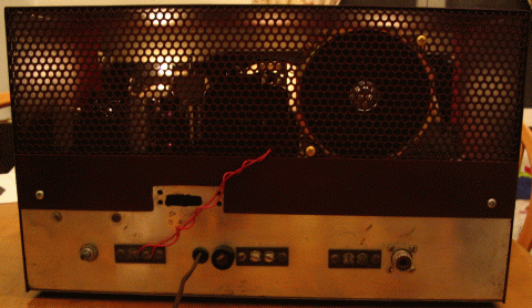 Notice custom terminal block on chassis, above mains cable grommet.