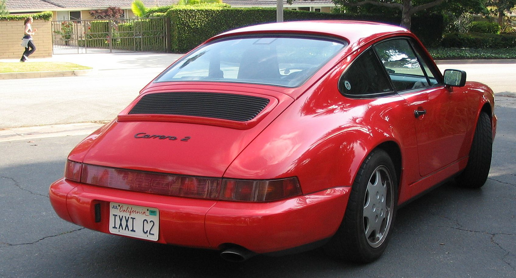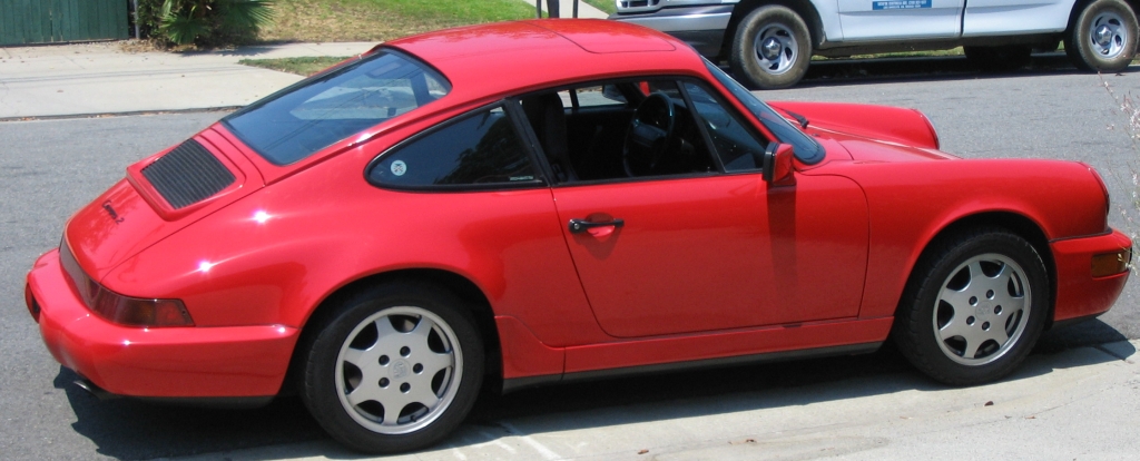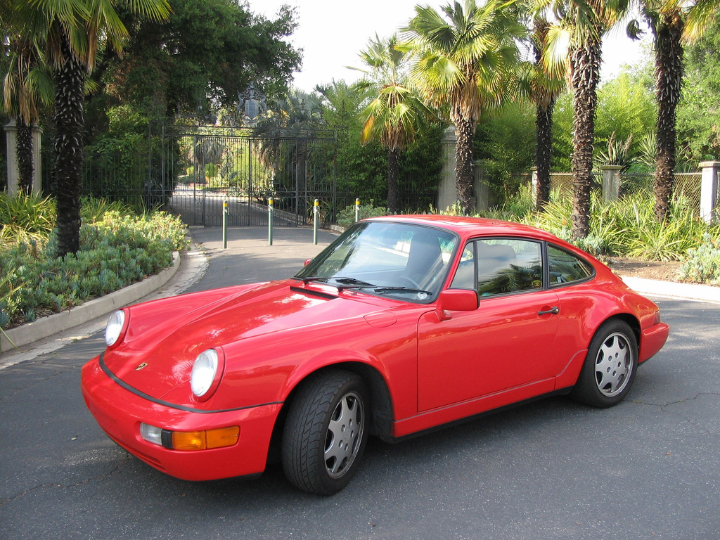Porsche 911 Carrera 2 (1991) "Bimbo" - Porsche 964(Bimbo is named in memory of my grandfather, James Bunn) SummaryThis is the colour called "Guards Red" with the Tiptronic transmission. It had 87,000 miles on the clock when I bought it. The car was delivered to its first owner in New Jersey in 1991, but after about 10,000 miles it changed hands and came to California in 1993, where it has been ever since. I am the fourth owner. The previous owner had apparently babied the car, and had it serviced at Dieter's in San Diego . In fact, all the previous owners had obviously taken very good care of it! "87,000 miles, Guards Red, Tiptronic, black leather interior. Condition inside and out is exemplary, although there are a few inevitable minor chips in the paint on the front bonnet lip and on the edge of the passenger door. Car has spent most of its three-owner life in Southern California, but originally delivered to its first owner in New York. Copious service history back to 1993. Went through the 90,000 mile service recently, distributer belt and O2 sensor replaced at that time. Passed recent smog test with flying colours. All controls, electrics, lights, interior fittings functioning correctly. Appears to be completely stock with the Design 90 wheels, original wing mirrors, sunroof, original tool kit, jack, spare tire, all identification labels present and matching, no bolt-on aftermarket exhaust or cat bypass, air box not drilled, etc., although it does have a "performance chip" installed - the original chip is in the glovebox. Bridgestone tires in excellent condition with even wear and lots left. The car needed a fresh injection of R12 in the A/C and then blew nice and cold, although the PO warned that this needs doing every six months, so suspect a slow leak. Stock speakers in front door were completely kaput and needed replacing. Engine mounts will probably need replacement. Minor oil leak around front pulley seal." Porsche Certificate of AuthenticityVIN: WP0AB2962MS410357 Engine: 62M51018 Transmission: 1002527 Exterior: Guards Red / G1 Interior: Black Interior - Partial Leather / LT Options: US Standard/Emission (Apparently in other countries, this colour was called "Indian Red", but in the USA was marketed as "Guards Red" to avoid offence.) Photographs