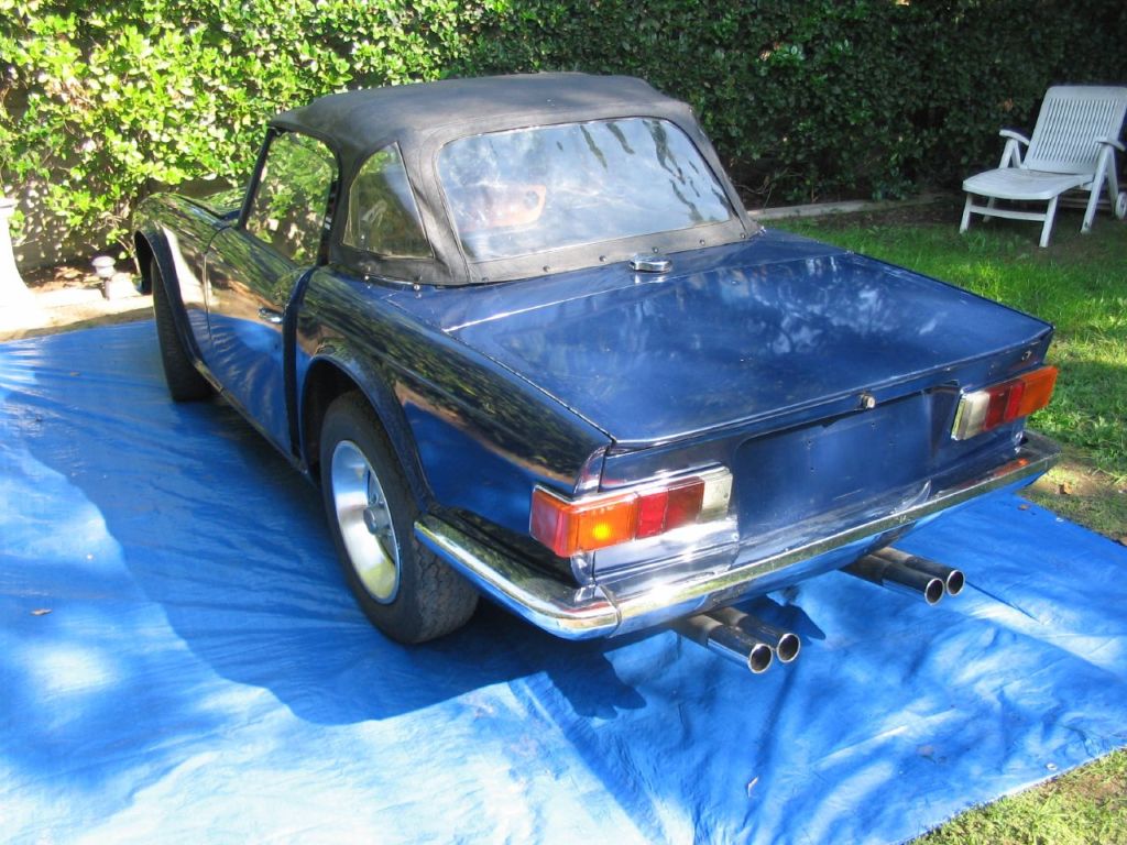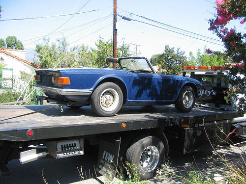 Here is the TR6 being delivered on a flatbed truck, after its journey down from Santa Barbara.