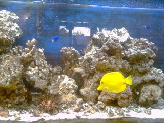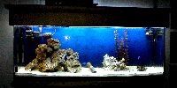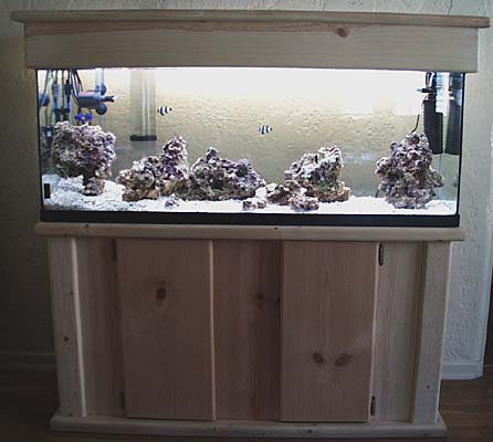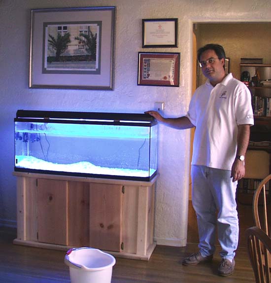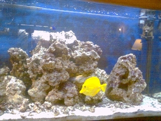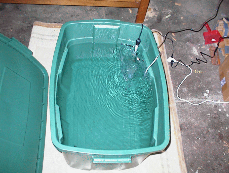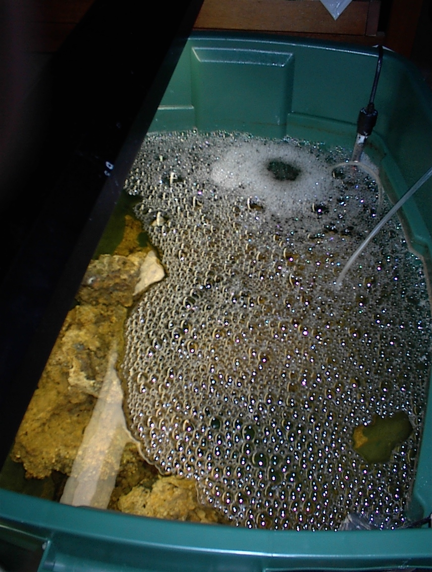 Shows the curing tank ready for the Live Rock, with bubbler and heater.