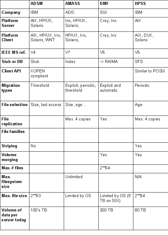The most often used commercial products are ADSM/IBM [ADSM], AMASS/Raytheon E-Systems [AMASS], DMF/SGI [DMF], EuroStore [EuroStore], HPSS [HPSS] and SAM-FS/LSC [SAM-FS].