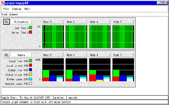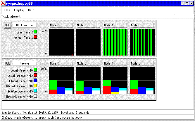 We used the "syspic" utility on the Exemplar to monitor the utilization of the 64 nodes in a hypernode during the tests. Before running the tests, syspic showed activity on Nodes 4 and 5 of the "happy00" cluster (user "ask" running multiple tasks). These are shown as green bars (user time) in the syspic display below: