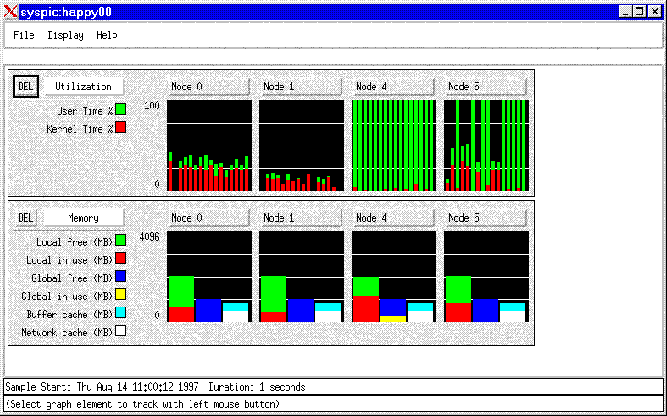 We then started up 64 simultaneous Objectivity database query applications on the happy00 cluster. The syspic display shown below was seen as the applications started up (hence the red bars indicating predominantly kernel time).