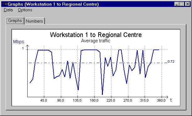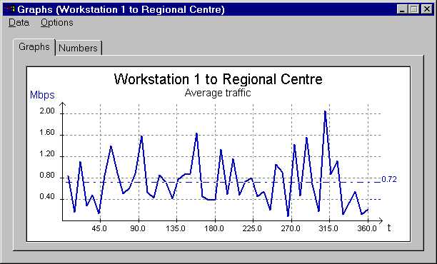 A graph of the network traffic between the physicist's workstation and the "Regional Centre" shows the expected average rate of ~0.72 Mbps. (Note the spikiness of the traffic, peaking at 2.05 Mbps and with a low of 0.09 Mbps).
